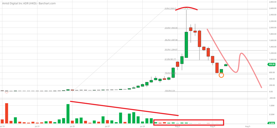 Currently, at $850, HKD may seem bullish in the short-term, but without volumes increasing the 61.80% Fibonacci at $980 is major resistance. As such, there are more chances the down leg continues after a brief retracement than getting past $1000.