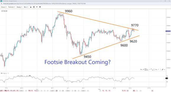 The 4-hour chart on Footsie shows an ascending triangle or pennant pattern may be in play. A breakout above 9770 could open the door to 9820 and the record peak of 9960, as RSI shows room for further upside. However, given the recent rejection at the upper trendline, losing the lower end near 9680 will expose the 9600-9620 area, with further declines pointing to 9450.