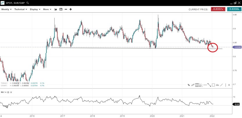 The euro-pound currency cross remains inside a long-term sideways range. Newfound BOE hawkishness means the price is sitting just above major support at 0.83.