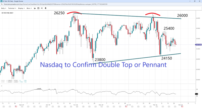 After the Nasdaq bottomed out at 24150 in early February, bulls have struggled to get through 25400, with price action consolidating in a tightening range. If Nvidia earnings trigger an upside and Nasdaq breaks the local peak and the upper pennant trendline near 26k, the index could reach a new record high. However, disappointing earnings could push the tech-heavy index towards 23800 if the lower pennant trendline gives way to bears. This would expose the 23000 psychological support, resulting in a confirmed double-top formation near 26250.