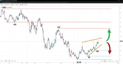Amazon's share prices resemble a rising wedge pattern which, if completed, could lead the stock to a short-term correction but propel it towards $147 in the medium term. Breaking past last August's high might expose $160 and the peak of $189. Contrary, and regardless of the short-term projection towards double digits, losing the $100 handle will increase the chances of further declines, opening the door to $81.50 should the swing of $90 succumb to potential pressure.