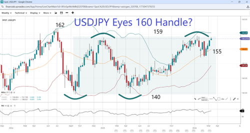USDJPY has been advancing for the past four weeks and since its technical rejection of the middle VWAP line currently at 155.00. Following a long-term double bottom pattern, prices increased to the neckline near 159.00, which has formed short-term resistance. Shy of the 160.00 handle and closer to the prior high of 162.00, a breakout could see prices revisit the critical levels. However, a failure to confirm a neckline breakout could signal a peak, especially since a spike higher could form RSI divergence and potentially trigger BOJ intervention.