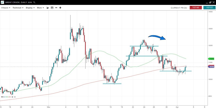 The Brent price did drop back under the 200 SMA but has stabilised after the second break, possibly setting up another rally over the 50 DMA in generally sideways price action.