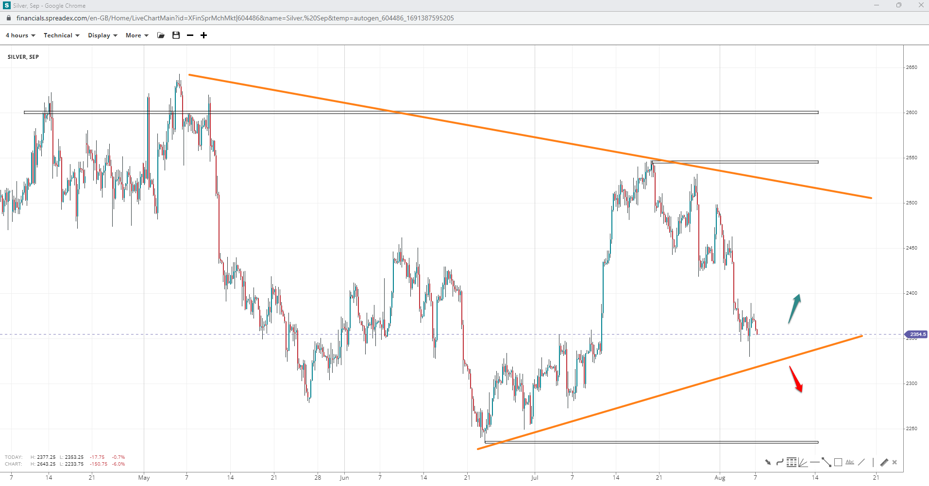 Silver has declined enough to increase speculation for a triangle pattern, pending further upside towards $25.45/oz but expected to fall short near $24.60oz. If prices descend under $22.30, a flag could be seen instead, opening the door to $21/oz and perhaps lower. Breaking past the regional top may extend gains towards $26/oz.