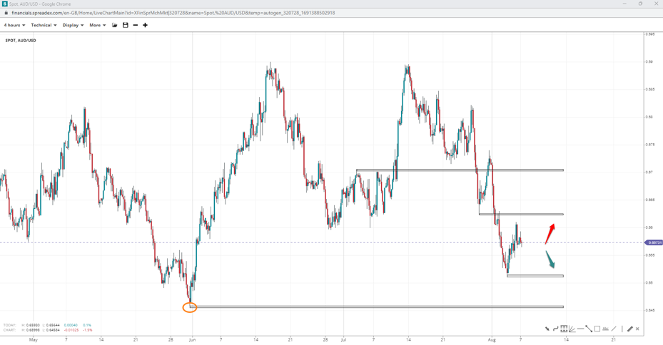 The swing low at $0.6515 may be temporarily seen as the bottom, but the double-top shy of 69 cents suggests an extended leg to the base of $0.6457. If bulls can push prices past $0.6623 the pair could advance to 67 cents. Conversely, losing 65 cents may see the descent pan out sooner than expected.