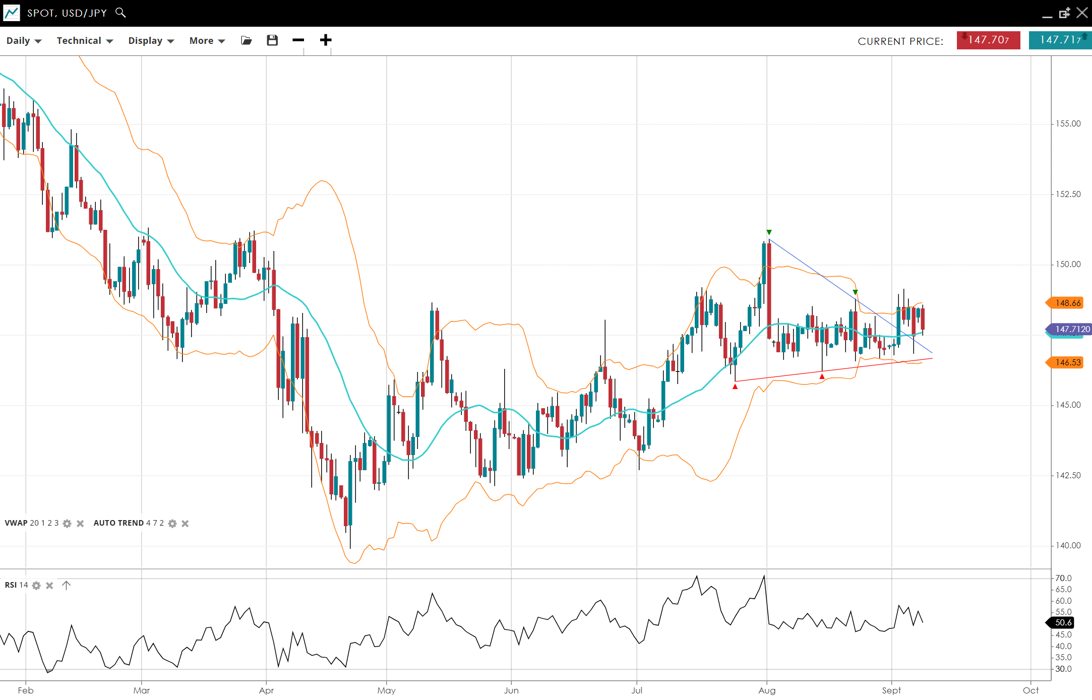 USD/JPY stays range-bound at 147.71 stalling after a triangle breakout, now just above the VWAP at 147.12. RSI at 51 reflects a neutral outlook. Support is 146.53, resistance 148.66.