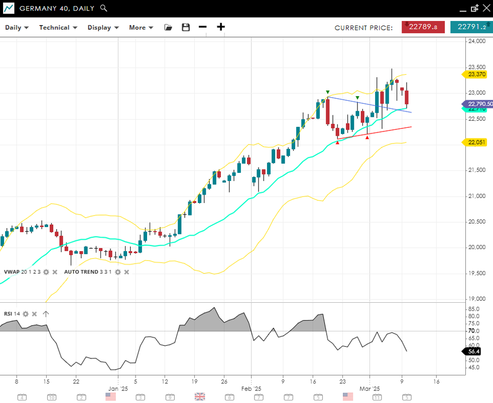 Germany 40 remains in a bullish, impulsive phase, with its price currently at 22,790, holding just above the 20‐day VWAP of 22,750. The RSI reading of 56 signals moderate momentum but is now signalling strong bearish divergence signalling an imminent trend reversal. Support is located at 22,051, while resistance stands at 23,370.