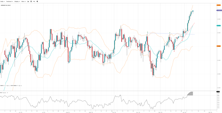 Germany 40 had made a major breakout of its 8-month price range into a new impulsive phase, trading at 25,332, well above the VWAP and the 25K round number. The RSI at 80.0 indicates strong momentum and overbought conditions.