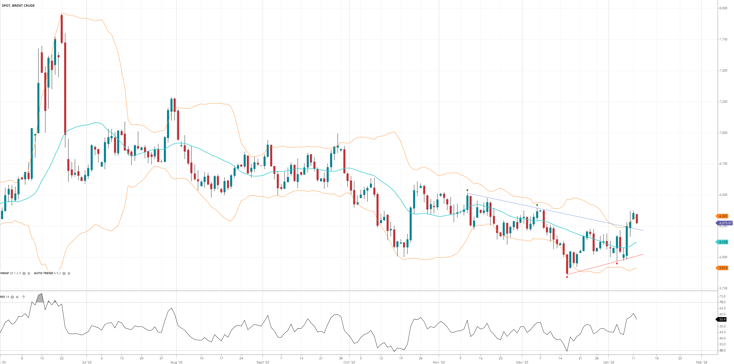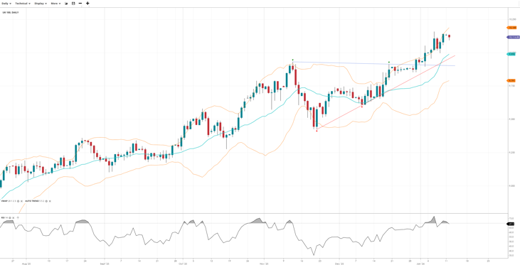 Brent Crude is still trending lower but has broken above a downtrend line, trading at 6,275 and now above its VWAP - suggesting a potential long term bottom around the 60.0 round number. The RSI is at its highest reading since September ‘25.