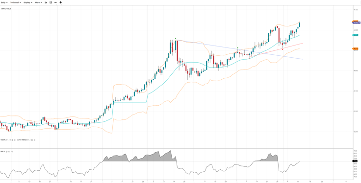 Gold remains bullish, having just unwound its last pullback with a break to a new record high, currently trading at 4,592 - comfortably above the VWAP. The RSI at 70.0 is entering overbought territory but still much lower momentum than seen at the prior peak.