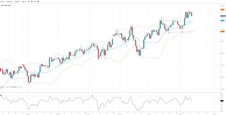Wall Street is undergoing a correction in its bullish trend, trading at 49,148, still above its VWAP at 48,770 and holding its triangle breakout. The RSI suggests a market with moderate momentum.