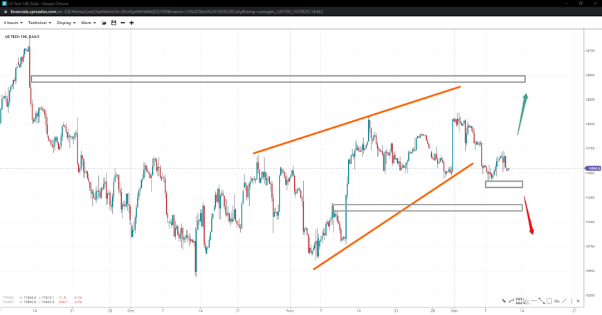 US Tech has started to fall after completing a rising wedge pattern. Sliding below 11400 might expose 11200 and the 11k handle, whereas an uptick higher might bring the 12k handle back into play. Breaching the top might send the index near 12500 for a trendline rejection.