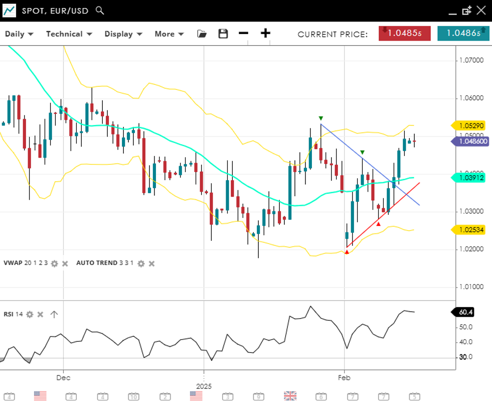 GBP/USD has also turned into a more neutral phase, trading at 1.2411, marginally above its VWAP (20) of 1.2379. Key support is found at 1.2109, while resistance stands at 1.2567. With RSI at 50, there is little momentum for a move either way.