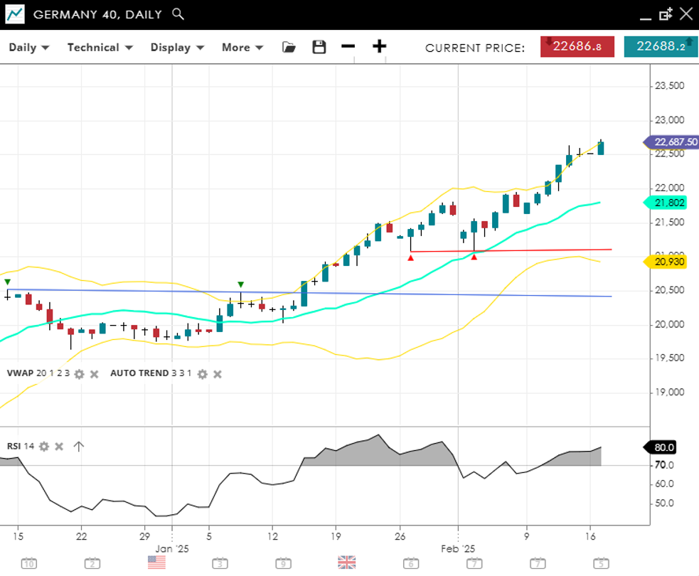 Germany 40 maintains its bullish momentum, currently trading at 21,740, well above its VWAP (20) of 21,399. The trend remains positive, with support at 20,825 and resistance at 21,974. An RSI reading of 66 signals sustained strength, though a third bearish RSI divergence is a sign a larger correction to the trend could be coming.