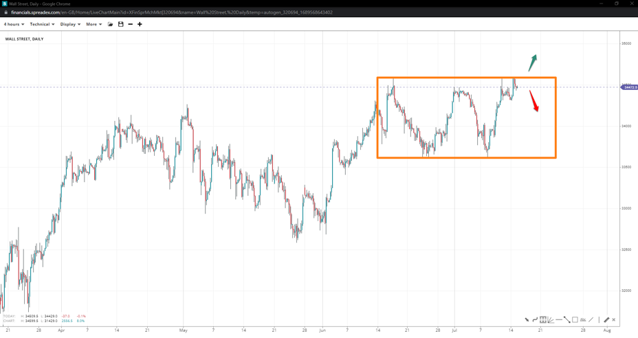 Wall Street formed a triple top at 34600, increasing chances of consolidation to 33610 unless the resistance fails to hold the line for an attempt to 35k.