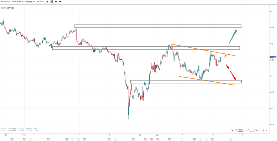 GBP/USD printed one lower low and one lower high, creating a bullish pennant that must break past 1.1500 for a chance at 1.1750. Failing to win over 1.1400 or the upper descending trendline will improve the probability of a flag instead, with 1.10 back on the cards.