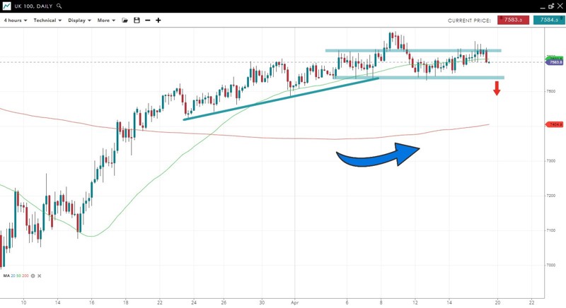 Price broke below the 50 SMA but has since oscillated around it after holding support from the early April lows. The uptrend is losing momentum with uptrend lines turning flatter. A break under 7,530 could usher in a bigger drop to the 200 SMA but otherwise the trend remains higher, indicating higher prices.