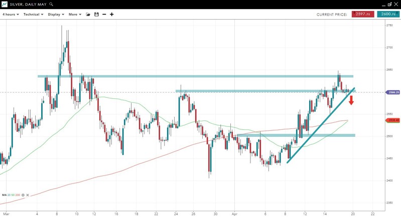 Gold has tested the psychological 2000 level after breaking out of its trading range and has now pulled back. Former resistance at 1970 could be support in the new uptrend. A break below an uptrend line connecting the March 29 and April 6 lows would negate the bullish bias.