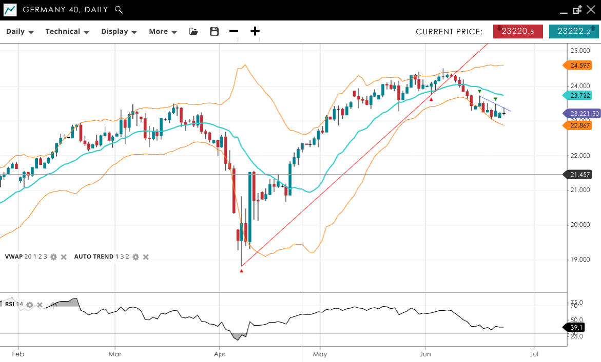 Germany 40 has turned bearish and is now in an impulsive move lower. It is trading at 23,222, notably below its VWAP of 23,732. The RSI at 39 signals weak momentum. Support is seen at 22,867, with resistance higher at 24,597.