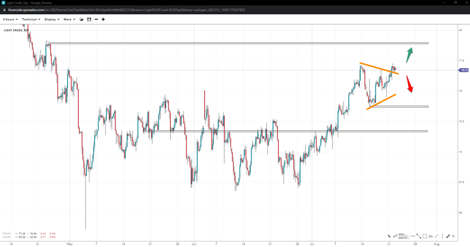 The price of natural gas completed a falling wedge by $2.48/cf, inspiring bets towards the peak of $2.93/cf and the 138.2% reverse Fibonacci of $3.1/cf. If bullish p[rice action disappoints, the structure might shift to a range or flag, raising the downside potential towards $2.30/cf should the regional low of $2.5/cf succumbs to pressure.