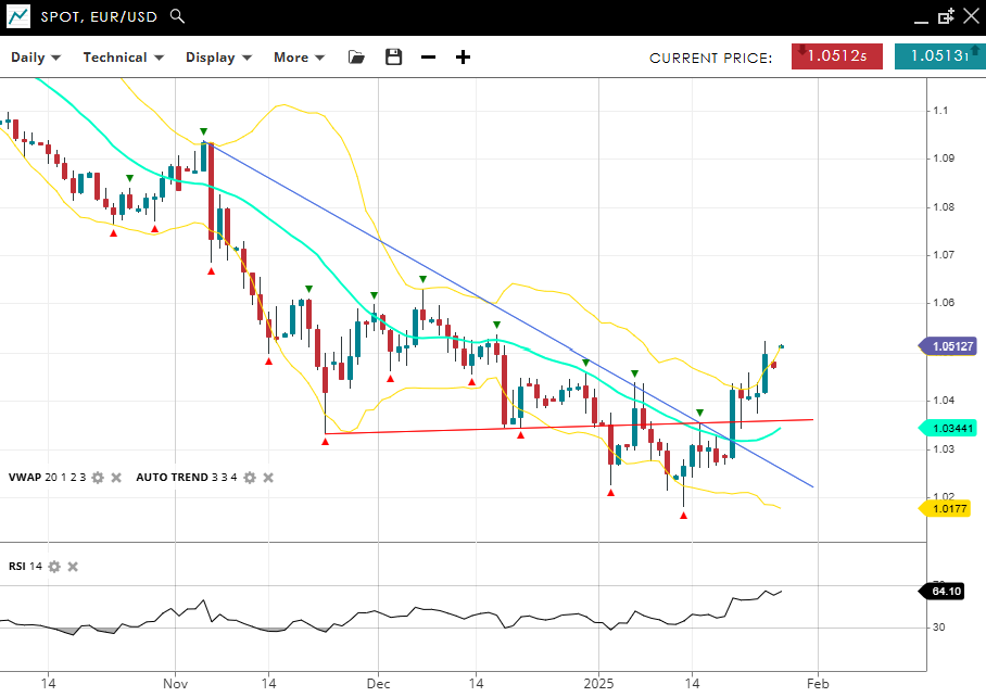 EUR/USD has entered a correction of its long running bearish trend, trading at 1.0512, just above its VWAP (20) of 1.0344. Support is defined at 1.0177, and resistance is capped at 1.0520. The RSI at 64 suggests bearish momentum is softening.
