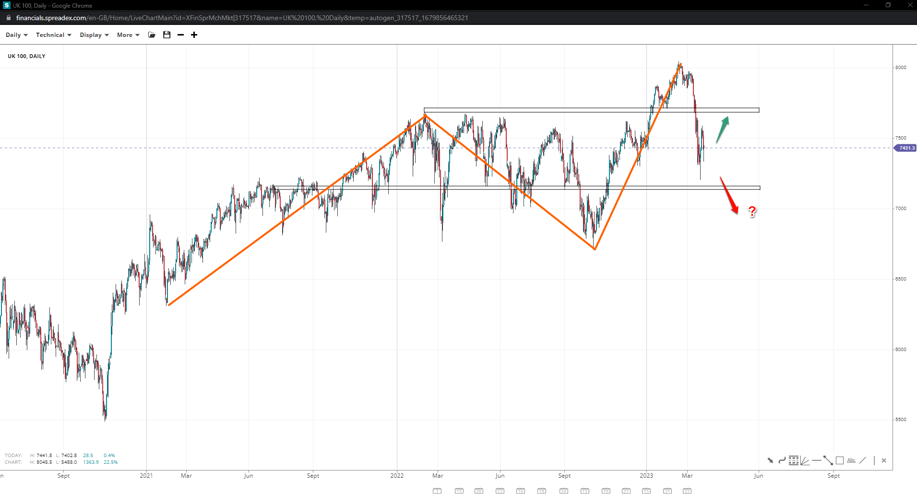 The UK’s 100 index might form a larger head-and-shoulders pattern, with the neckline down at 6700. If 7700 holds in case of increased longs, the index might revisit last week’s low of 7200 and perhaps lower. Otherwise, an extension to 7870 might be seen.