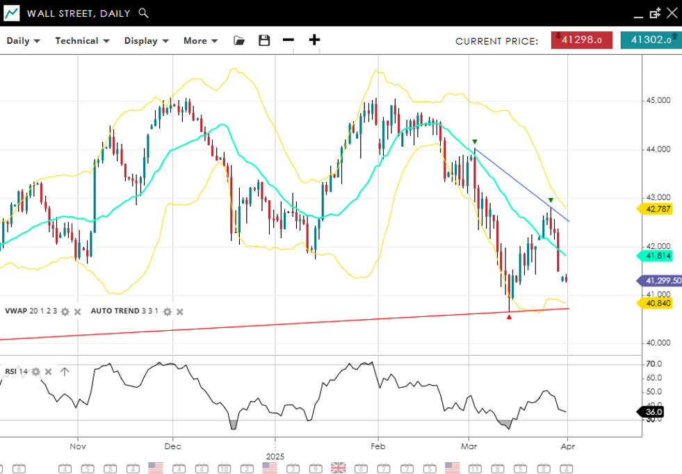 Wall Street continues in a bearish trend with a corrective bounce already having rolled over as of Friday, currently at 41,299—just below the VWAP of 41,814. An RSI of 36 (having failed to overcome the 50 level) suggests a lack of bullish conviction. The key downside level is 40,840, while 42,787 stands as initial resistance on any recovery.