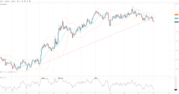 EUR/USD has broken down into a 3-month low but remains in an overall neutral trend, trading at 1.1515 and under its VWAP of 1.1614. The RSI at 33.1 hints at building downside momentum. Support is found at 1.1500, with resistance at 1.1710.