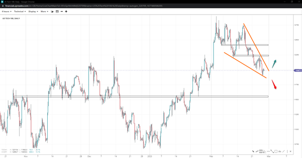 The US TECH index has either completed or is near completing a wedge pattern, increasing the chances of a pullback to 12250 or a dip towards 12405. Losing the swing low of 11895 might clear the path to 11540, but it is unlikely to close the week below there.