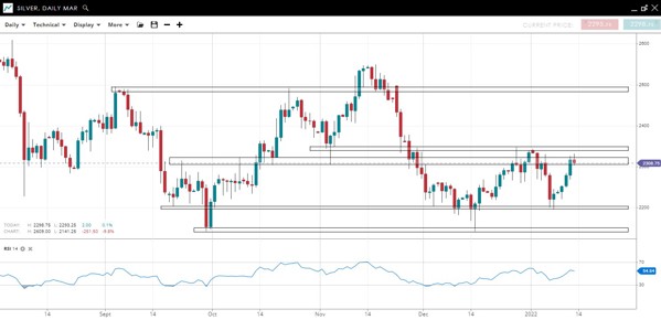The false breakout to new highs on Jan 4 has led to a choppy pullback to the former record high from August 2021. Three long tails on daily candlesticks in the past week suggest strong demand.