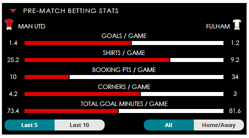 To see all the Man Utd v Fulham betting stats and form, visit our pricing page to view our Pre-Match betting stats table or hover over/tap the chart image to see previous outcomes for that particular market.
