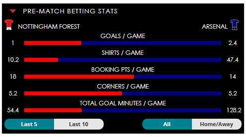 To see all the Nottingham Forest v Arsenal betting stats and form, visit our pricing page to view our Pre-Match betting stats table or hover over/tap the chart image to see previous outcomes for that particular market.