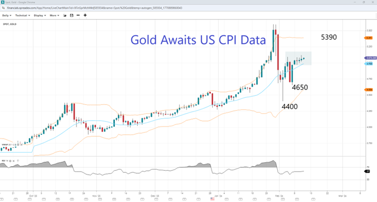 Friday marks the release of January CPI figures, with the headline rate expected to dip to 2.5% from 2.7% a month ago, primarily due to a drop in fuel costs. The core rate is anticipated to cool at a more modest rate to 2.5% from 2.6% prior, above the Fed's 2.0% target. Markets are pricing in a more than at the upcoming March meeting (up from around 80% before the jobs data). An unexpectedly large drop in inflation could bring back the possibility of a rate cut, which could support gold. However, hotter inflation would likely weigh on gold prices as the market pushes forward expectations of Fed easing.