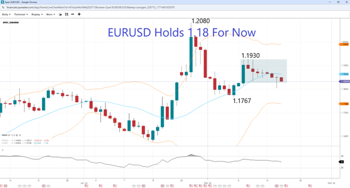 After peaking at 1.2080, EURUSD turned lower to 1.1760 but has since recovered some, with 1.1800 acting as a major support level. However, as the VWAP upper and lower bands are flattening out, a sideways continuation could keep prices within the 1.1738-1.1990 range, putting emphasis on short-term moves. On the downside, minor support lies at 1.1767, while on the upside, resistance sits at the early February high of 1.1930.