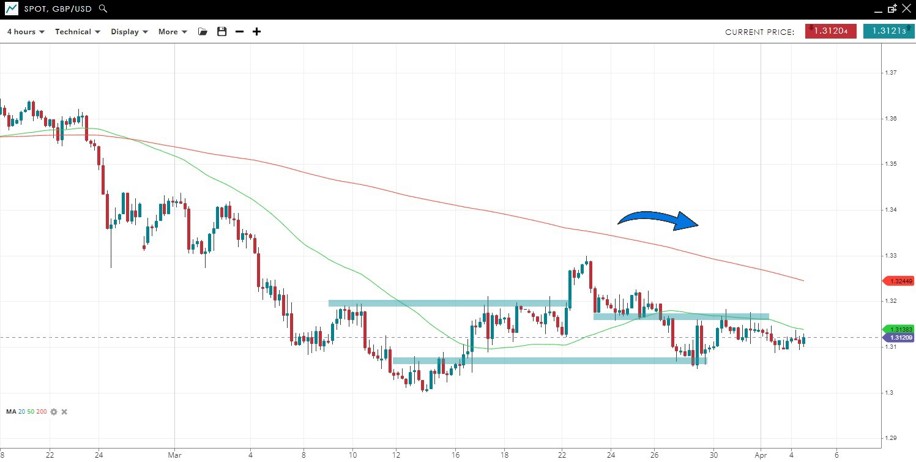 Gold slid under its 200 SMA but rebounded off the March 17 low, leaving it in a sideways range under 1950. Whether near term support at 1920 holds may determine which way the range breaks.
