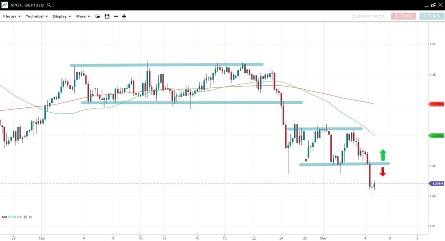 Price has dropped under support formed by the two spike lows at 1.327 to open up another leg of the downtrend. 1.32 is the next support from the YTD low.