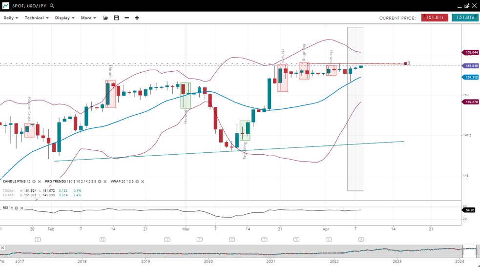 USD/JPY has maintained its bullish trend, tracking sideways while still in the  impulsive phase, with its price slightly increased to 151.81, above the 20-period VWAP of 150.11. The support has been adjusted up to 149.57, with resistance at 152.64. The RSI at 64 indicates a slight decrease in bullish momentum compared to the previous reading.