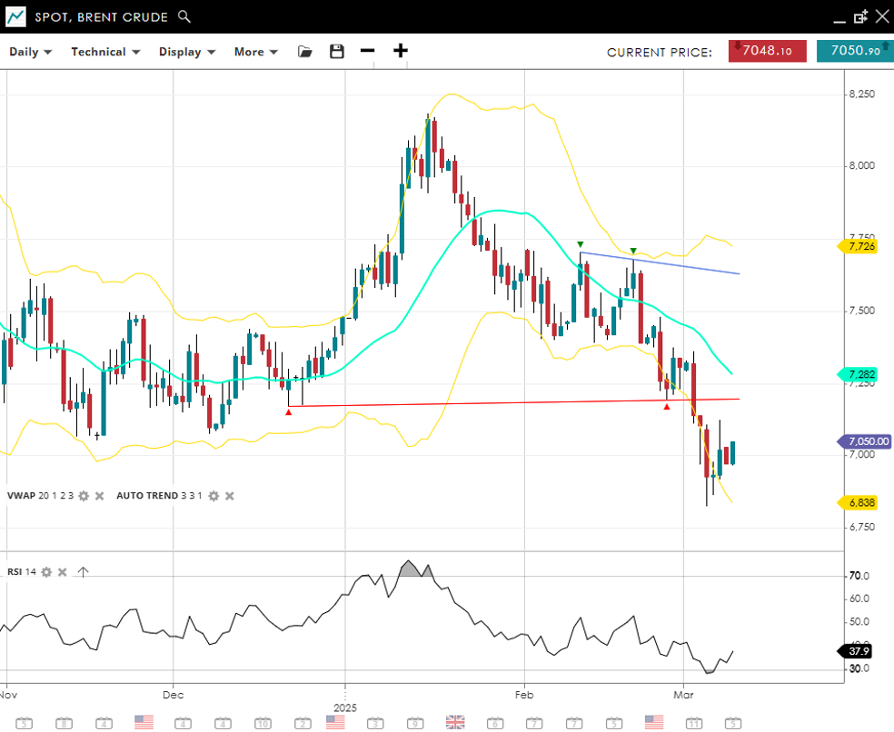 Brent Crude is now in a bearish, impulsive phase, trading at 7050, well beneath its 20‐day VWAP of 7282 - testing the big 70 level. The RSI reading of 38 underscores persistent selling pressure. A break below 6838 support could accelerate the downtrend, whereas 7726 acts as resistance.