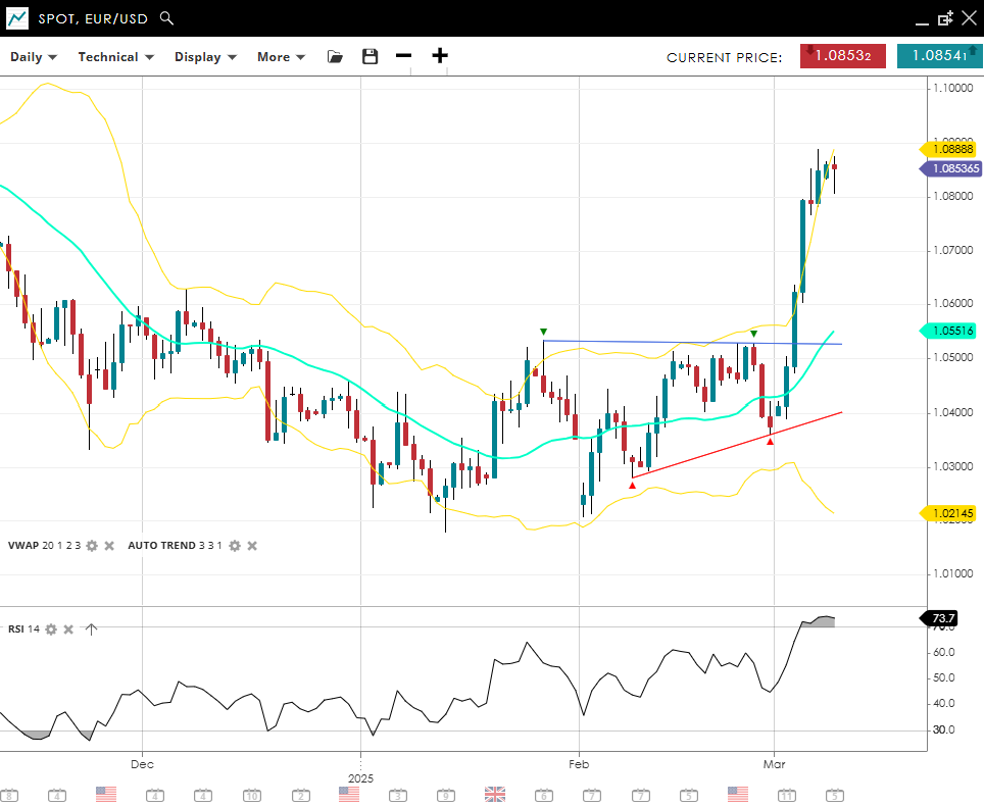 EUR/USD has undergone a huge reversal and turned bullish, entering an impulsive rally to 1.0853, comfortably above the 20‐day VWAP of 1.0552. The RSI of 74 suggests overbought conditions or very strong upward momentum. Support sits at 1.0215, with 1.0889 resistance from the local high being the next hurdle for further gains.