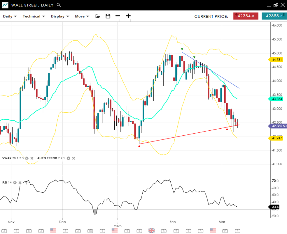Wall Street has turned bearish, with an impulsive drop placing price at 42,385, well below the 20‐day VWAP of 43,364 and just above the 2025 low. The RSI of 33 indicates strong downside momentum, verging on oversold territory. Support aligns at 41,947, while resistance back at 44,781 marks a key barrier against further recovery.