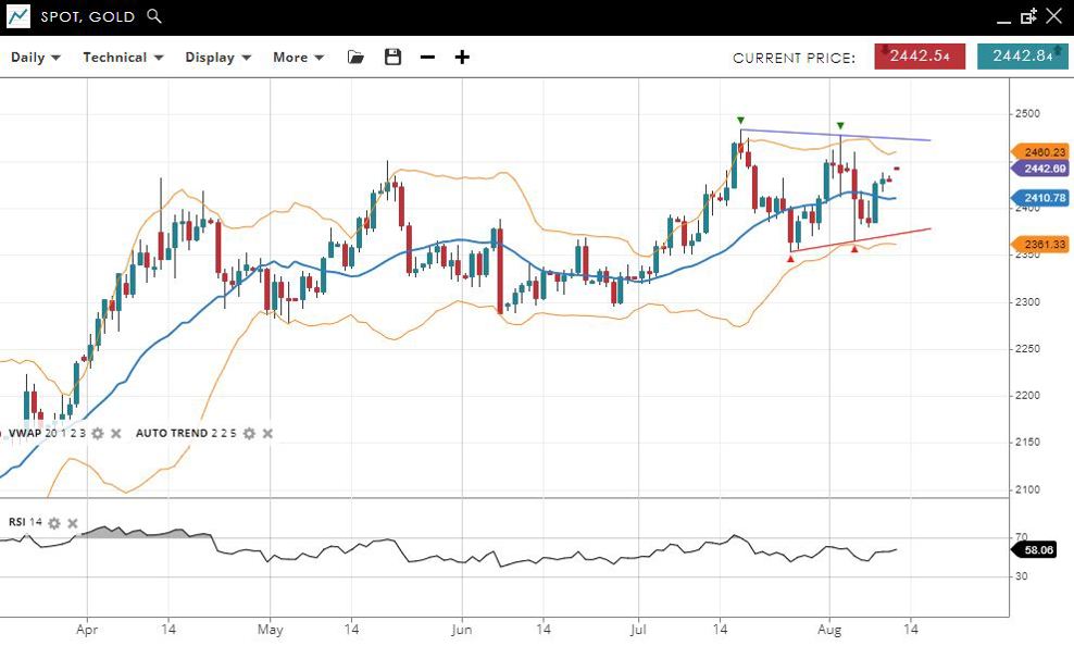 Gold is showing a neutral trend and is in a consolidation phase, with the price increasing to 2,442, above the VWAP of 2,410. Support has been lowered to 2,361, while resistance has risen to 2,460. The RSI stands at 58, suggesting the momentum is slightly leaning towards the bullish side.