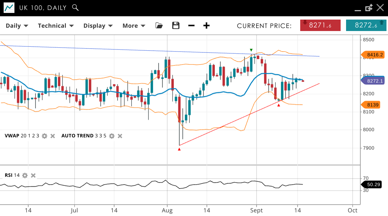 UK 100 is neutral, continuing its consolidation phase. The price is at 8,272, close to the VWAP of 8,275. Support is at 8,139, and resistance is at 8,416. The RSI at 50 suggests stable momentum.