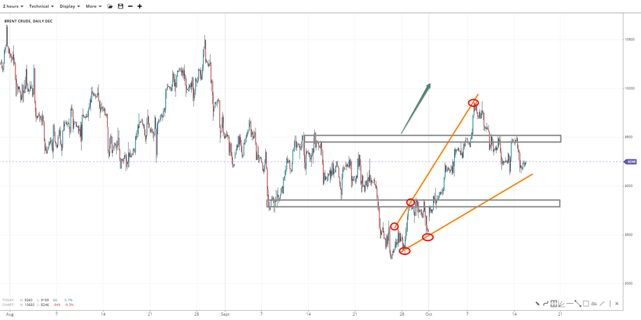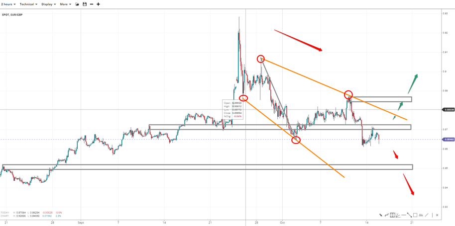 EUR/GBP is at risk of further downside below 0.8700 as chances of a broadening descending wedge increase below the upper trendline. 0.8700 is minor resistance bulls must overtake, and 0.8870 is below 0.9900. Another low is probable as the range of the last leg should be larger than its preceding. This brings 0.8225 into the spotlight if 0.8500 is lost.