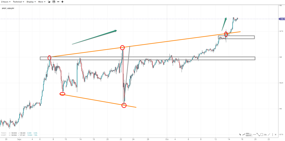 USD/JPY sailed past the upper trendline of the broadening top formation near 147.50 with eyes on the round 150.00. The measured move between the previous high-to-low target is 151.50, however. If bears strengthen below 147.50, 145.00 comes back on the radar.