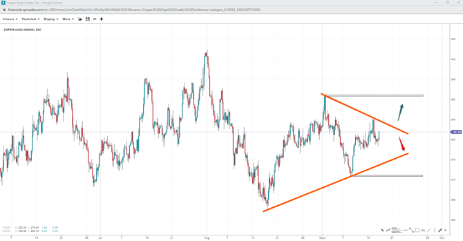 The long-term formation in copper resembles a triangle that may or may not have completed its fourth (out of five) corrective wave at $385/t. Further upside past $391/t could validate a prolonged wave or invalidate the pattern with a bullish pennant should prices move beyond $402/t. Falling under $371/t may instead see bearish momentum towards $362/t increase.