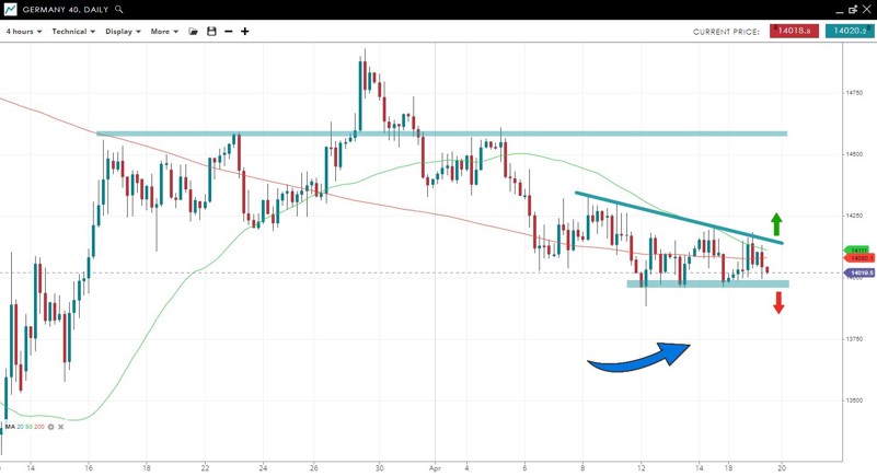 Price is caught between a downtrend line and horizontal support from the recent lows. A break above the downtrend line would suggest the correction from the March 29 peak is over. Resistance can be found from the April 5 peak. A drop under support at 13,950 would negate the bullish bias.