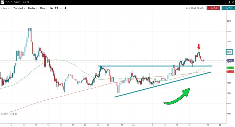 Gold has tested the psychological 2000 level after breaking out of its trading range and has now pulled back. Former resistance at 1970 could be support in the new uptrend. A break below an uptrend line connecting the March 29 and April 6 lows would negate the bullish bias.