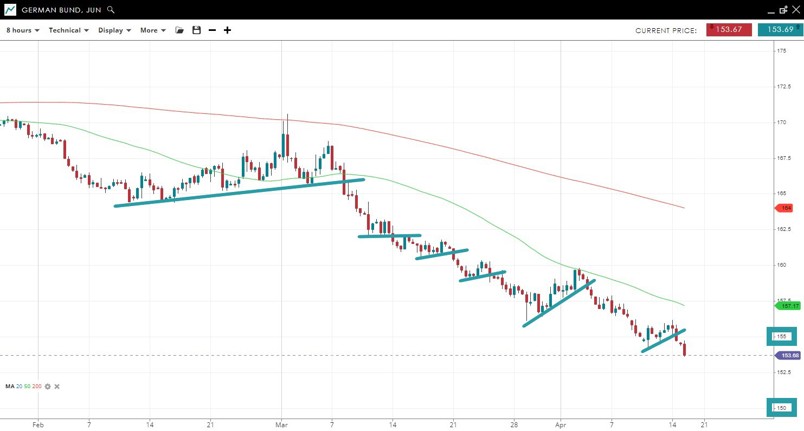 As yields keep rising, bond prices are falling. The German bund has just broken down from 155 and looks to be targeting the psychological 150 level below.