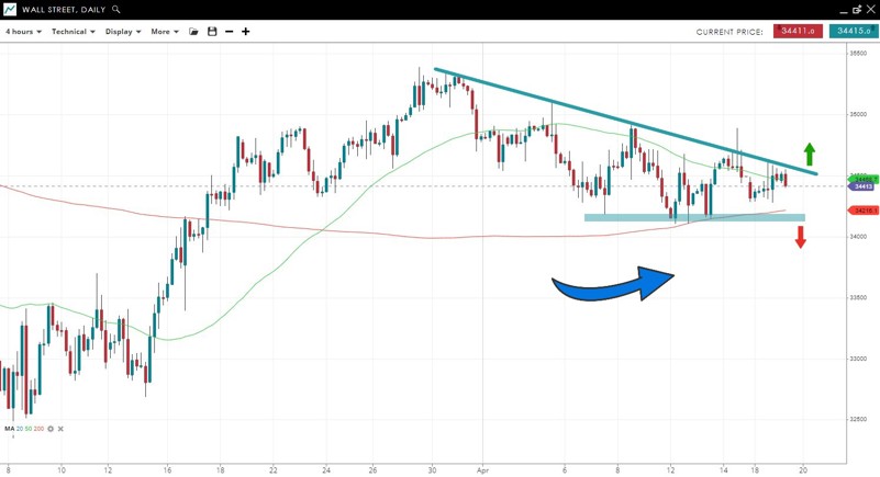 The price is stuck between a downtrend line and a floor at 34,100. The move lower from the March 30 peak looks like a correction after a long uptrend, suggesting an eventual upside break and resumption of the uptrend. A break under 34,100 support would negate the bullish bias.