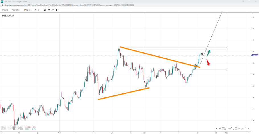EUR/CAD completed a triangle pattern at 1.4622 and is soaring toward the peak at 1.4938, with the measured move suggesting a rally towards 1.53 but likely to stop by 1.50 initially. If bulls fail to surpass the top or the 1.49 handle, a retracement at 1.4740 may be seen in case 1.48 weakens.